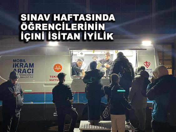 Tekirdağ İl Müftülüğü ve TDV Tekirdağ Diyanet Vakfı öncülüğünde Tekirdağ İl Müftülüğü Gençlik Koordinatörlüğü, Bilge Gençlik Öğrenci Topluluğu ve TDV Tekirdağ Şubesi Gençlik kolları tarafından, Final Haftasında ‘‘İçimizi Isıtan İyilik sloganıyla Tekirdağ Namık Kemal Üniversitesi kampüsünde öğrencilere sıcak çorba ikramında bulunuyor.
